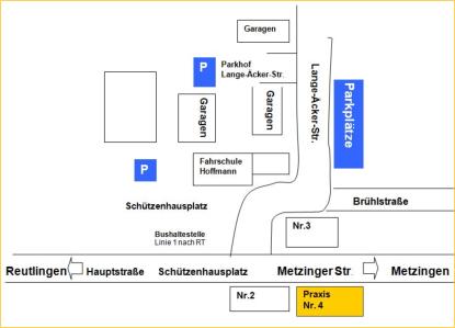 oder auf den zwei beschilderten Praxis -Parkplätzen im Parkhof in der Lange-Äcker-Straße.